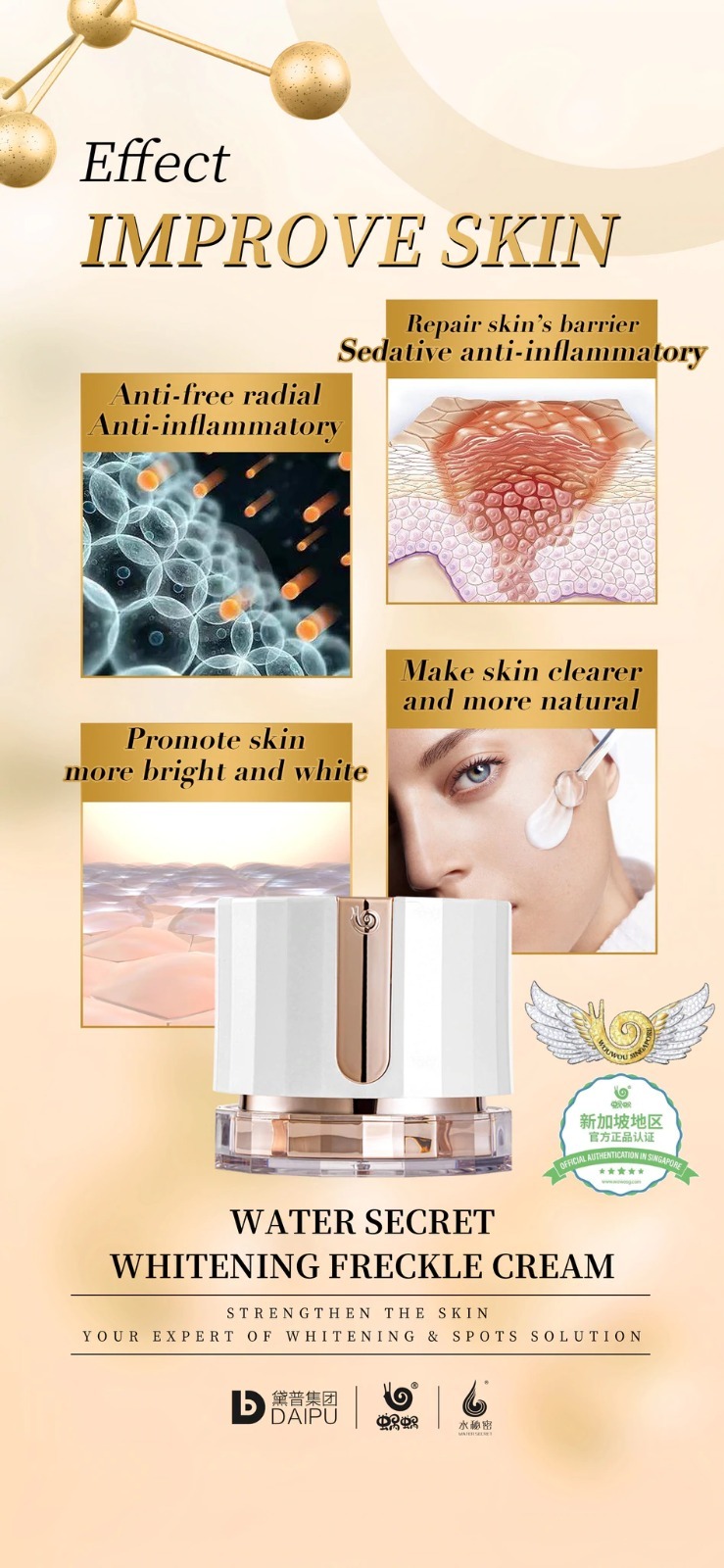 WOUWOU Freckle Removal Cream 30G Principle of Wouwou whitening Freckles Removal Cream: 1. Block melanin signal transmission 2. Prevent the formation of tyrosinase 3. Inhibit melanin formation 4. Block melanin transmission 5. Control melanin to lighten spots Directions to use this water secret whitening cream is very simple. The first step is to take an appropriate amount of cream and apply it on the face. You can apply a little more on the spots. The second step is to massage to absorb. Our Water Secret Whitening Cream has a good texture and excellent spreadability. It is easy to apply, easy to absorb, moisturizing and not greasy.