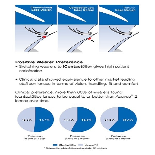 iContact55ev was designed to provide an optimal balance of handling, comfort and vision. The lens has been enhanced with aberration correcting aspheric optics to optimize the overall visual experience and encompasses a design philosophy that addresses the wearer handling and comfort needs.