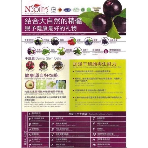 Ingredients: ♥ Acai berry ♦ Blackberries ♥ Cranberries ♦ Raspberries ♥ Blueberries ♦ Elderberry ♥ Moringa ♦ Stevia ♥ Agarwood leaves ♦ Comprehensive enzymes ♥ Plant collagen ♦ Apple stem cells ♥ Grape stem cells ♦ Argan stem cells