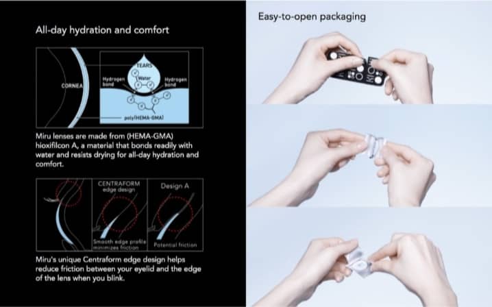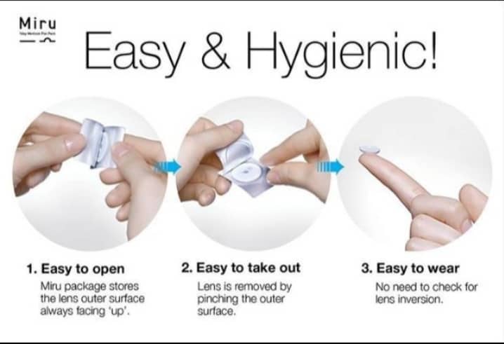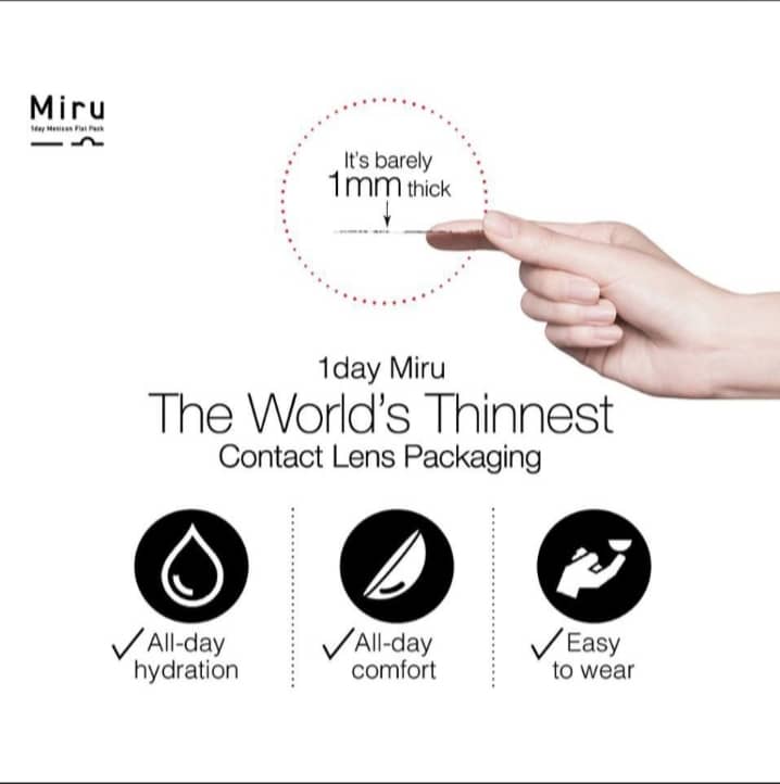 Miru's 1mm flat pack isn't just slim. It also opens easily, and presents the lens with the outer surface facing up. So there's no fumbling about, and dirt and oil on your fingers are less likely to get transferred to the surface of your eye.