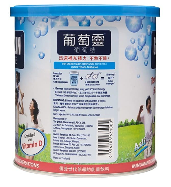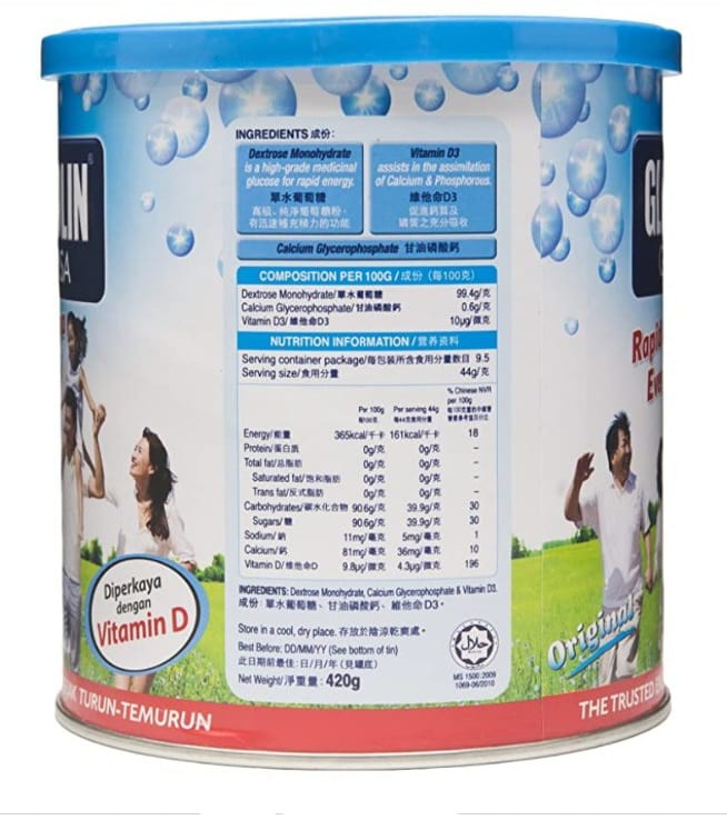 Glucolin Original Glucose energy supplementation with calcium and Vitamin D provides rapid energy everyday. In addition the calcium helps build strong bones and teeth while the Vitamin D assists in the assimilation of calcium and phosphorous.