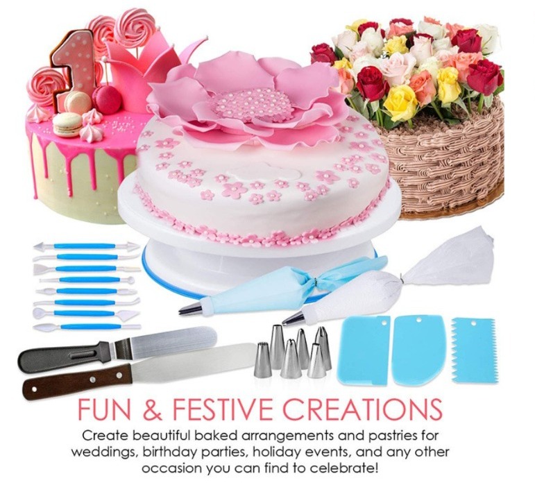 EXQUISITE BAKING & PASTRY MASTERPIECES! You don't need a white chef's jacket to create divine, decadent, and undeniably delectable cakes, cupcakes, cookies, and other delicious desserts & baked goods. Go all-out with this ultimate kitchen set! ELABORATE DECORATING CHOICES - Achieve professional decoration results with beginner experience - this reusable cake making accessories pack is designed for all ages and levels. Enjoy easy coloring, fondant modeling, scraping & everything else! INCREDIBLE VALUE - Quality 207 pcs decorating set! We use BPA free, safe silicone and stainless steel materials to fashion our premium quality tips, tools and baker utensils CREATIVE & THOUGHTFUL GIFT - We love sharing our passion for baking and decorating and we hope you will too! Surprise your wife, husband, girlfriend, boyfriend, mother, sibling or friend with a spectacular and unique gift on birthdays and holidays. PREMIUM HIGH GRADE DESIGN: AJ Gear is committed to the superior quality of our products at every stage of the manufacturing process. 107 Piece kit is a combination of BPA Free Plastic & Stainless Steel decorating tools. 100% Dishwasher Safe.
