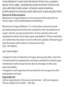 Blackmores Sugar Balance is formulated with nutrients to assist sugar and carbohydrate metabolism. Blackmores Sugar Balance is a chromium-based formula providing important nutrients needed for the metabolism of sugar, and for energy production. It also contains zinc and magnesium which also help sugar metabolism. These nutrients are utilized by the body to aid in efficient uptake of blood sugar into the body cells where it is burned as fuel.