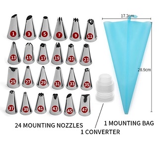 - Package Included: 1 Reusable Pastry Bag & 24 pcs Stainless Steel Nozzle & 1 Converter