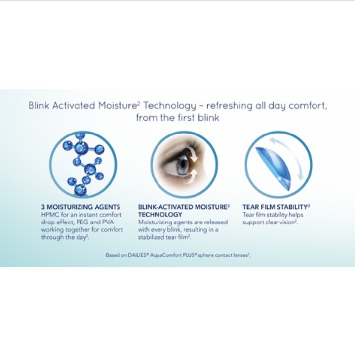 Experience 1-Day Acuvue Moist, the perfect combination of fresh new lens everyday, comfort and performance! The EYE-INSPIRED Design provides an exceptional wear using a Dual-Action Technology – “Moisture In” and “Irritation Out”. The LACREON Technology creates a long lasting cushion of moisture to keep “Moisture In”, while lab testing has shown the lens helps maintain one of the most abundant protein in the tear film in its natural state to keep “Irritation Out”.