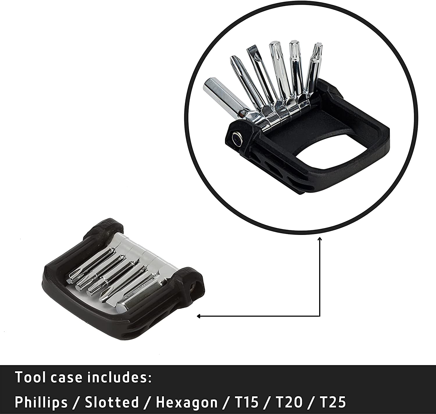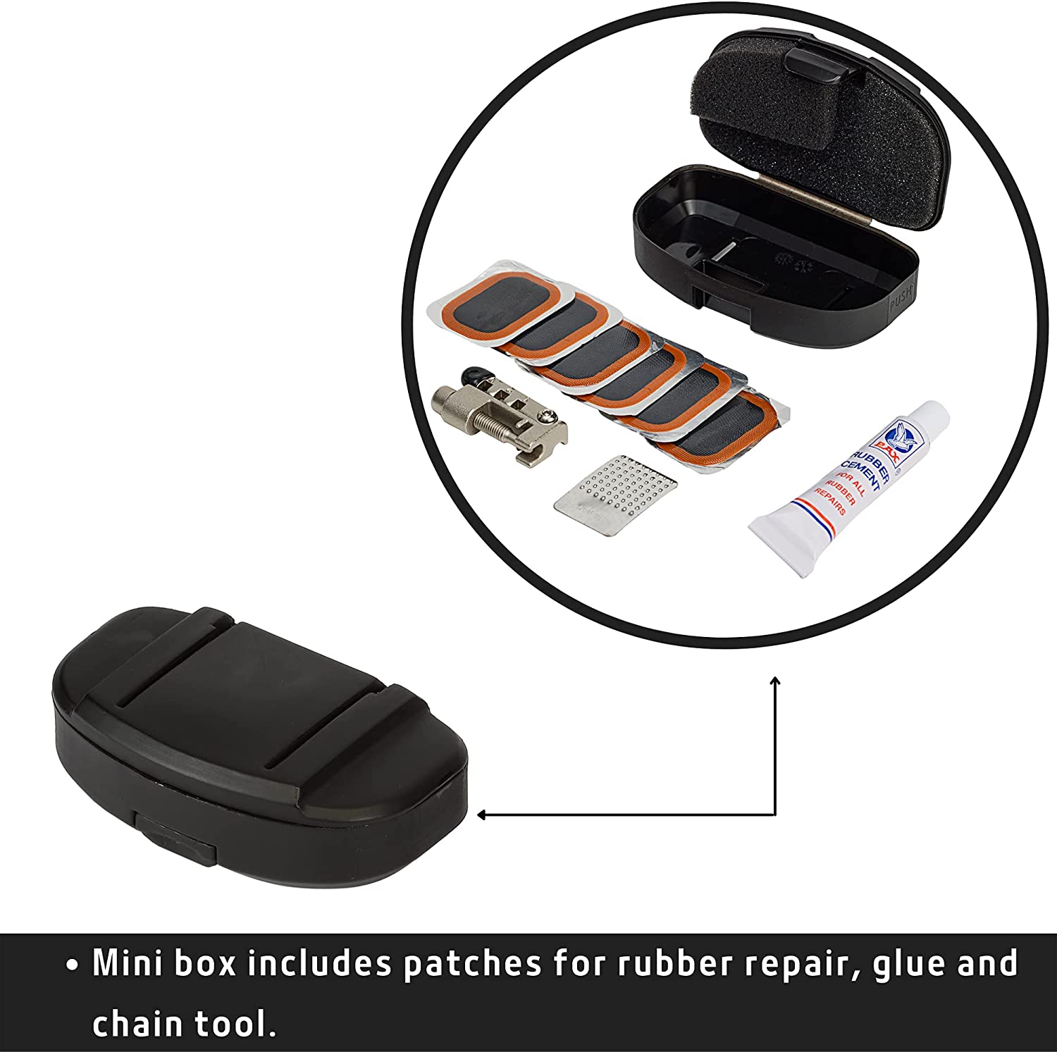 How to use it? With tool case and built-in mini tool box (included patches for rubber repair, chain tool) that’s easily accessed with a simple push. Included a precision full metal function mini tool that is comfortable in the hands for repairs.