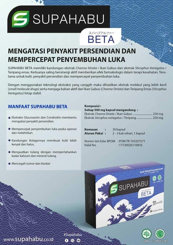 Supahabu Beta memiliki kandungan eksrak Channa striata/ ikan gabus dan ekstrak Sticophus variegatus/ teripang emas. Keduanya saling bersinergi aktif memberikan efek farmakologis dalam terapi kesehatan serta dapat menjadi pilihan sebagai suplemen untuk membantu memelihara kesehatan, daya tahan tubuh serta menambah gizi.