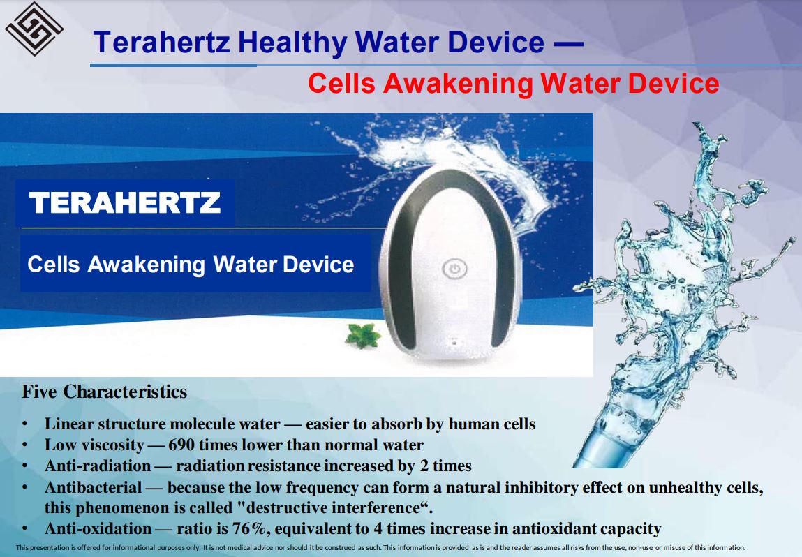 0.96 Terahertz water device is a 6G high tech device using 0.96 Terahertz electromagnetic wave to breakdown clustered water become single molecule which will be easily absorbed by body cells.