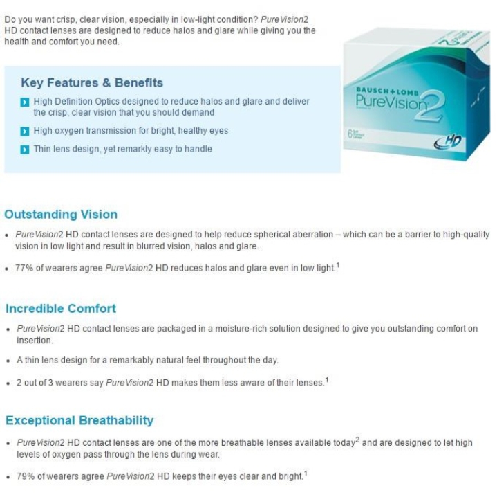 PureVision2 HD lenses are packaged in an innovative solution featuring poloxamine – a moisturizing surfactant – designed to deliver outstanding comfort on insertion for first fit success.