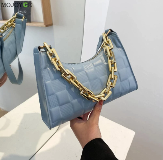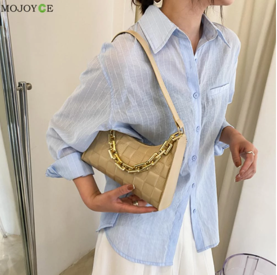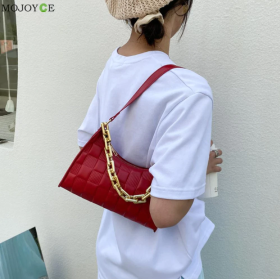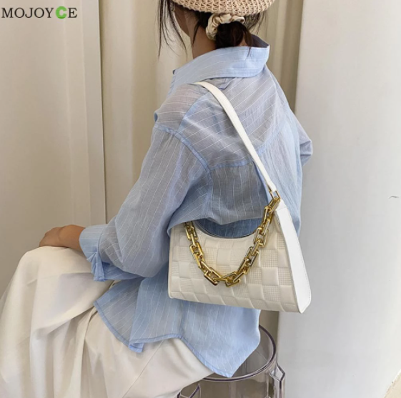 Vintage Women PU Leather Checker Pattern Shoulder Underarm Bag Casual Ladies Thick Chain Small Hobos Handbags Purse